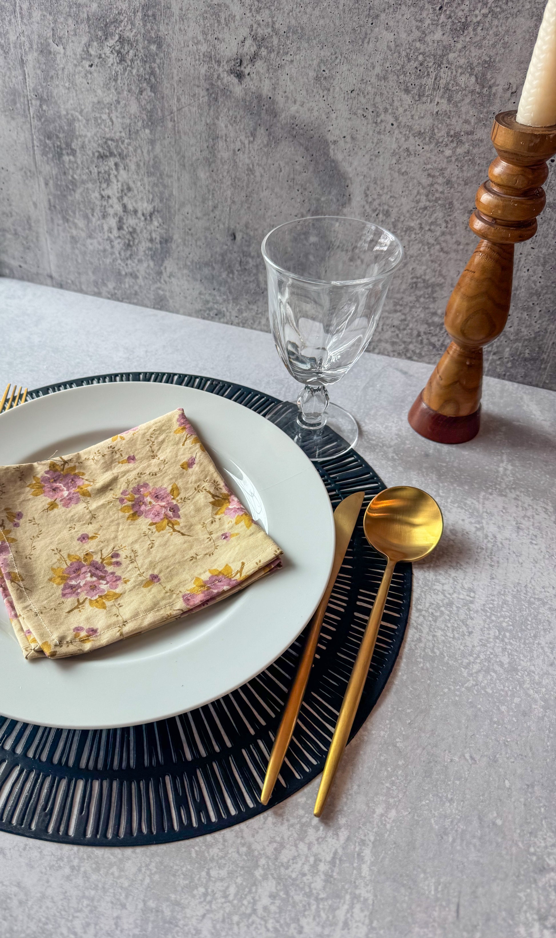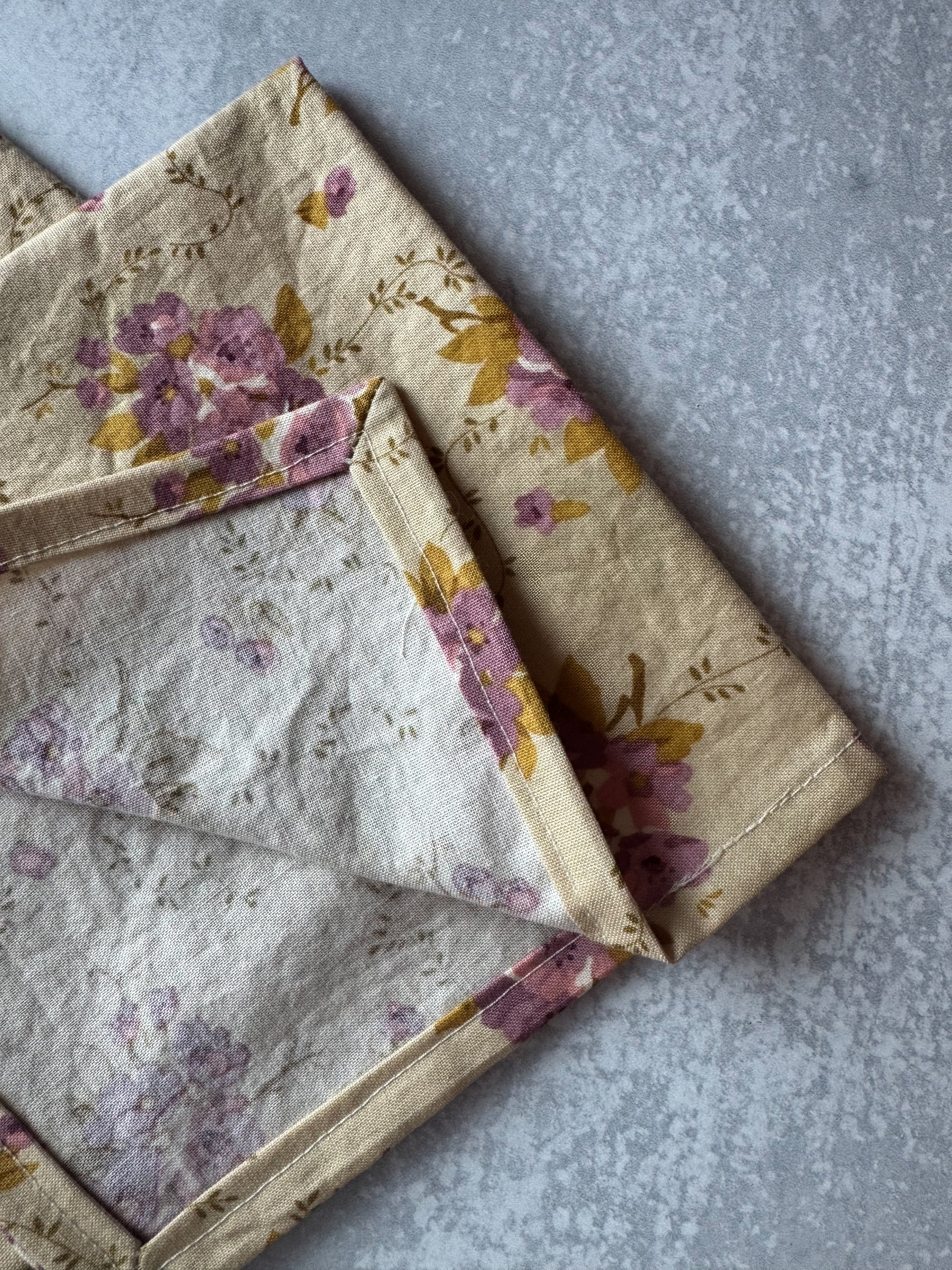 A softly romantic table essential, made for slow mornings and beautifully set gatherings. These handmade cotton napkins feature a warm neutral base with blush-mauve blooms and golden touches - effortless with everyday dishes, and special enough for hosting.